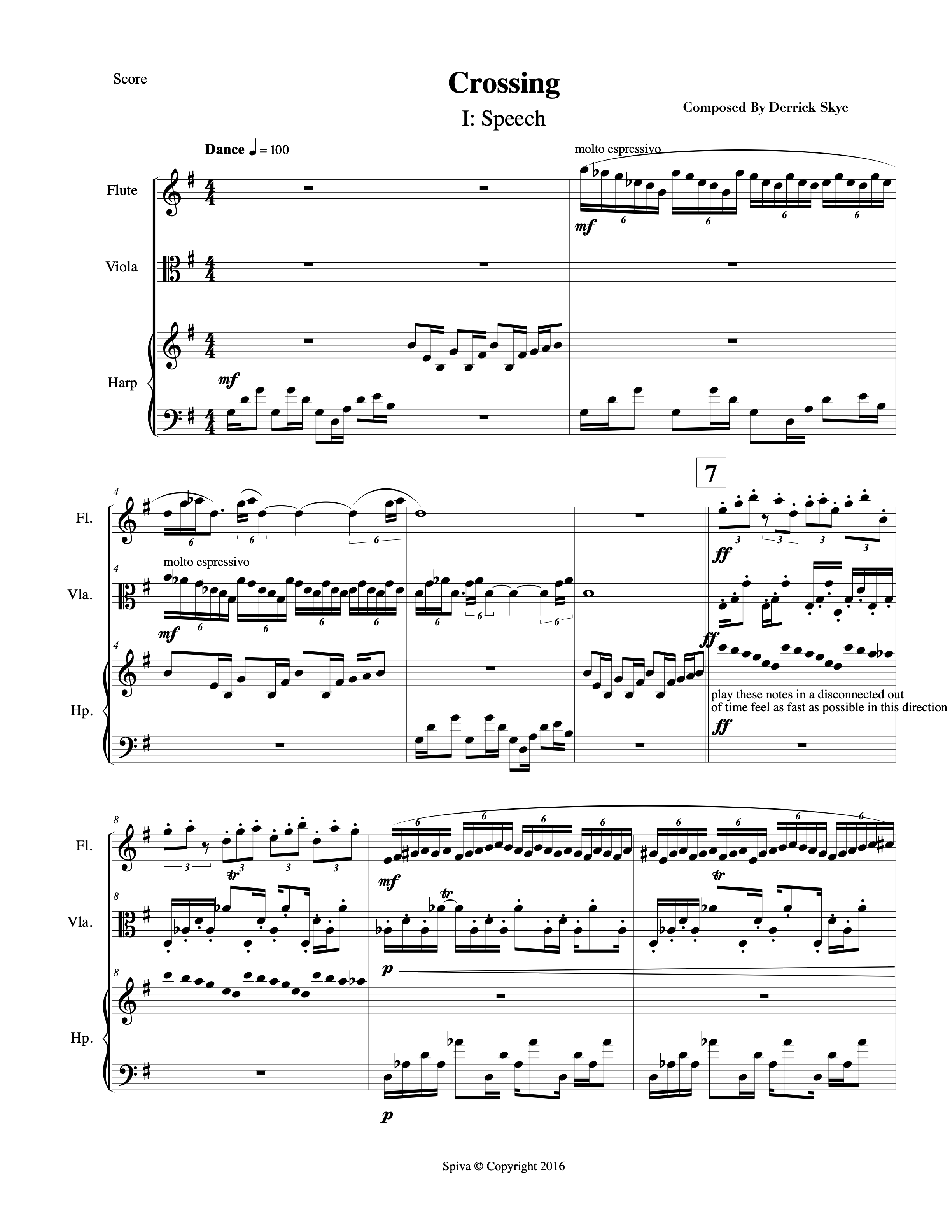 Crossing is a piece that explores the musical elements of vocal and gestural communication, inspired by the melodic shapes often found in Balkan folk music. The first movement uses fluctuating and overlapping patterns in its melody resembling speech in a 4/4 meter. The second movement includes asymmetrical fragmented phrases at a fast tempo with leaps, resembling laughter, in an 11 beat cycle. The third movement uses repeated patterns of shifting meters (5/16, 7/16, 6/16, 8/16) to create a folk melody that is intuitive, as if being sung and improvised.